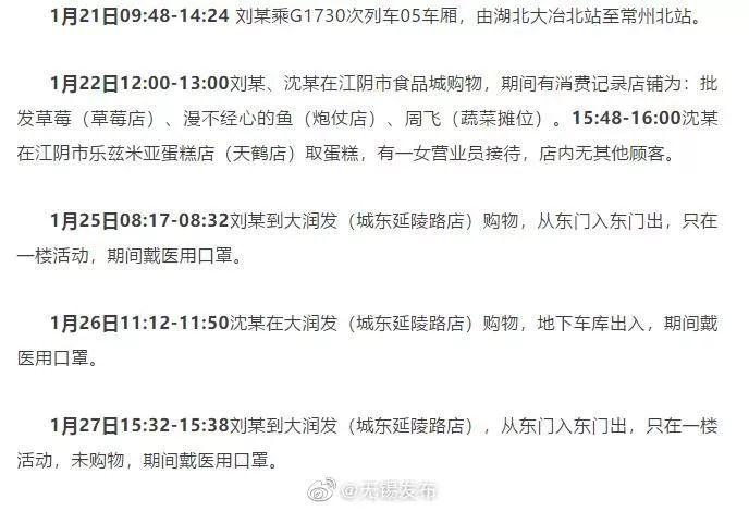 無錫江陰新型冠狀病毒感染的肺炎確診病例2劉某、病例3沈某(為病例2的兒媳),目前兩人均在市定點(diǎn)醫(yī)院隔離治療,病情穩(wěn)定 。在流行病學(xué)調(diào)查時(shí),發(fā)現(xiàn)劉某、沈某有以下出入公共場所活動軌跡,現(xiàn)緊急尋找相關(guān)接觸人員。
