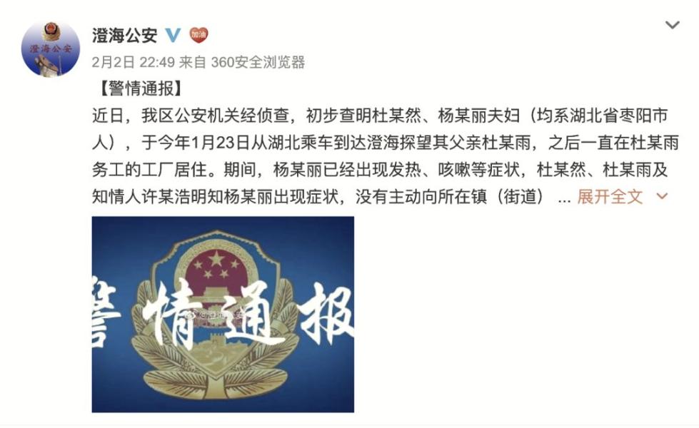2月3日凌晨, 廣東省汕頭市公安局澄海分局發(fā)布警情通報。