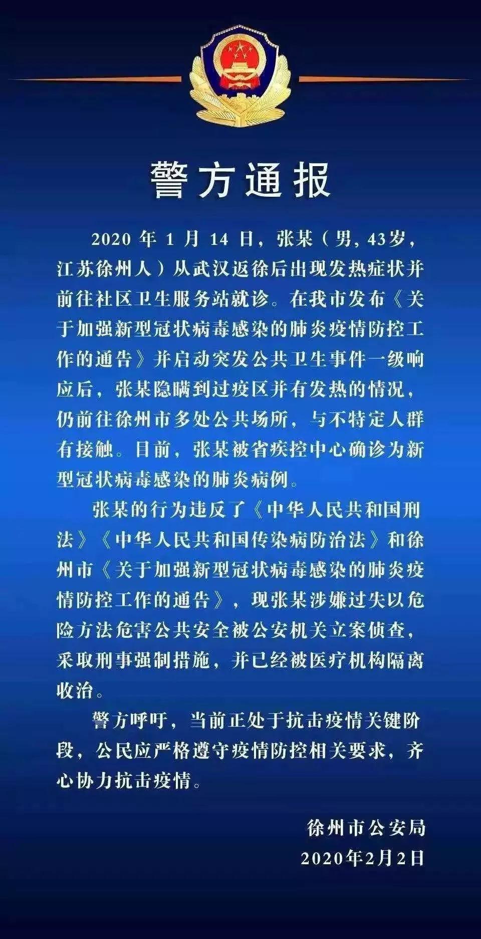 2日晚,徐州市公安局發(fā)布一則警方通報,針對一名武漢返徐人員,在身體出現(xiàn)發(fā)熱癥狀后,明知徐州已發(fā)布疫情防控相關(guān)規(guī)定,在就診時故意隱瞞病情及武漢旅居史,并到多處公共場所與不特定人群接觸,該男子隨后被確診為新型冠狀病毒感染的肺炎病例。