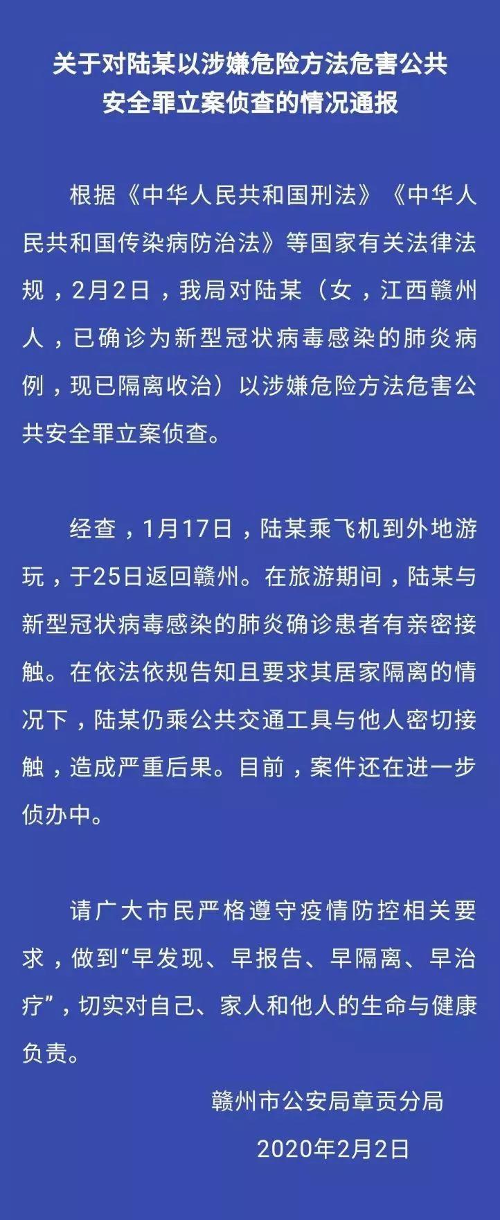 2日晚,江西贛州市公安局章貢分局通報,陸某(已確診為新型冠狀病毒感染的肺炎病例,現(xiàn)已隔離收治)居家隔離期間仍乘公共交通出行,被公安機關(guān)以涉嫌危險方法危害公共安全罪立案偵查。經(jīng)查,1月17日,陸某乘飛機到外地游玩,于25日返回贛州。