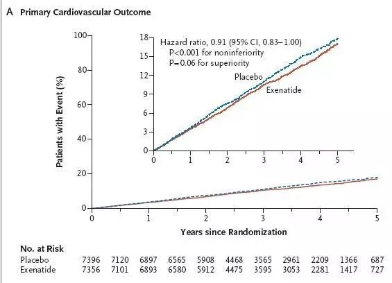 EXSCEL研究共入選全球35家中心的14752例患者,73.1%既往有心血管疾病病史,HbA1c水平在6.5%至10%之間,將患者分為艾塞那肽周制劑組(7356例)及對(duì)照組(7396例)。中位隨訪時(shí)間3.2年。結(jié)果顯示,艾塞那肽組主要復(fù)合終點(diǎn)事件發(fā)生839/7356例(3.7例/100人-年),對(duì)照組發(fā)生905/7396例(4例/100人-年),HR為0.91(95%CI 0.83~1.00)。在安全性方面,艾塞那肽周制劑非劣效于安慰劑(P<0.001),在有效性方面,也不優(yōu)于安慰劑組(P=0.06)。兩組間的心血管死亡、致死性或非致死性心肌梗死、致死性或非致死性卒中、心衰住院、急性冠脈綜合征住院、急性胰腺炎、胰腺癌、甲狀腺髓樣癌及其他不良反應(yīng)沒有顯著差別。