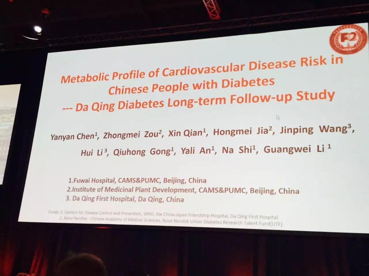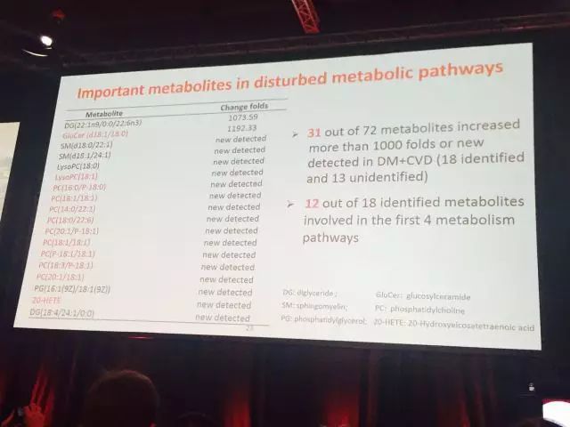 里斯本時間9月14日上午,在Fitzgerald Hall,中國醫(yī)學(xué)科學(xué)院阜外醫(yī)院陳燕燕教授代表團隊匯報了“中國糖尿病人群心血管疾病風(fēng)險代謝特征——大慶研究長期隨訪結(jié)果”。通過對大慶研究人群進行長期隨訪,發(fā)現(xiàn)72種代謝產(chǎn)物及8種代謝途徑與糖尿病心血管疾病相關(guān),其中18種代謝產(chǎn)物在糖尿病合并心血管疾病人群中升高超過1000倍。多變量回歸分析顯示2種代謝物(20-HETE、Palmitoyl sphingomyelin)可能是糖尿病合并心血管疾病的獨立危險因素;其中4種代謝途徑與糖尿病心血管疾病高度相關(guān)。