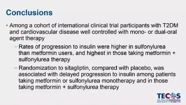 TECOS試驗(yàn)亞組分析結(jié)果表明,在接受二甲雙胍單藥治療和二甲雙胍+磺脲類聯(lián)合治療的2型糖尿病患者中,加用西格列汀可使因病情進(jìn)展需胰島素治療的時(shí)間延遲。